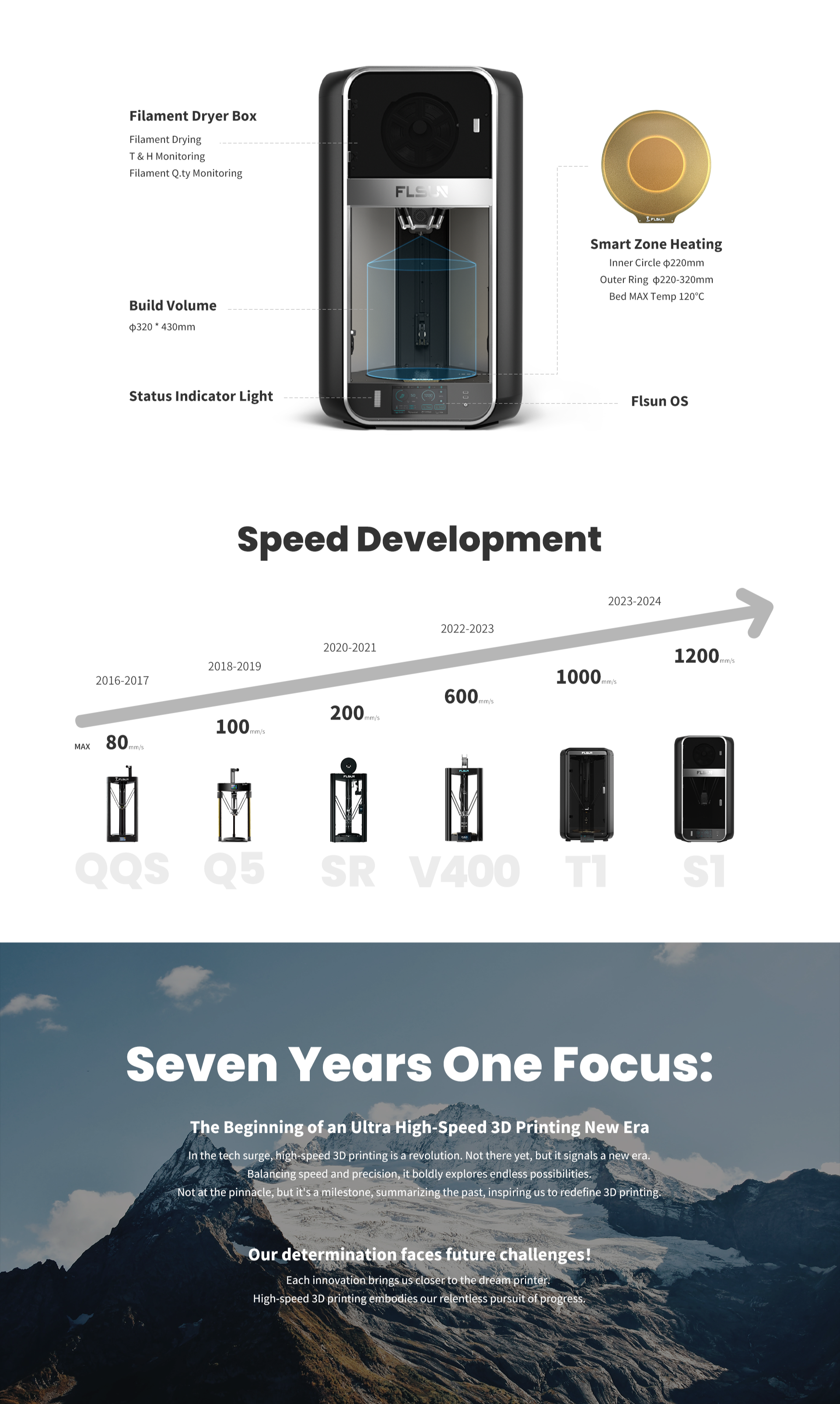 Explore FLSun's latest and greatest breakthroughs with the S1 printer, pushing the boundaries of speed and quality. The S1 printer focuses on ULTRA High-Speed 3D printing without compromising quality. With a delta structure and an all metal frame ensuring exceptional stability during ultra high-speed printing.