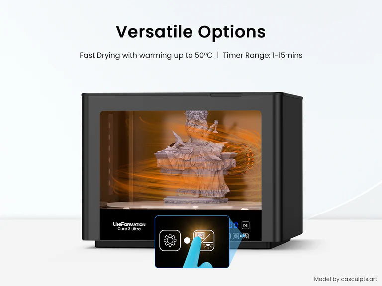 Fast Drying Settings: 100% dried prints are always necessary. If IPA is left on the model before curing, it will easily leave white marks and cracks. The curing station is equipped with a heated drying system that allows to set the timer from 0 to 15 mins, ensuring the prints are ready for optimum curing.