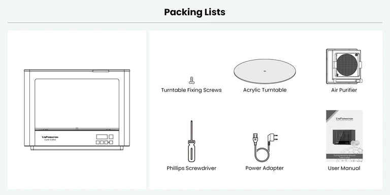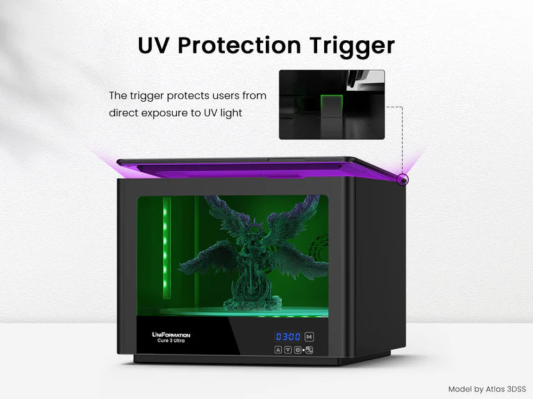 Safety Protection Trigger: The resin curing station will not run when the flip-hinged lid is open, the trigger will work as a safety precaution. Moreover, a plastic protective case on the curing station is provided to protect the users from direct exposure to the UV light, while still allowing users to observe the curing status.